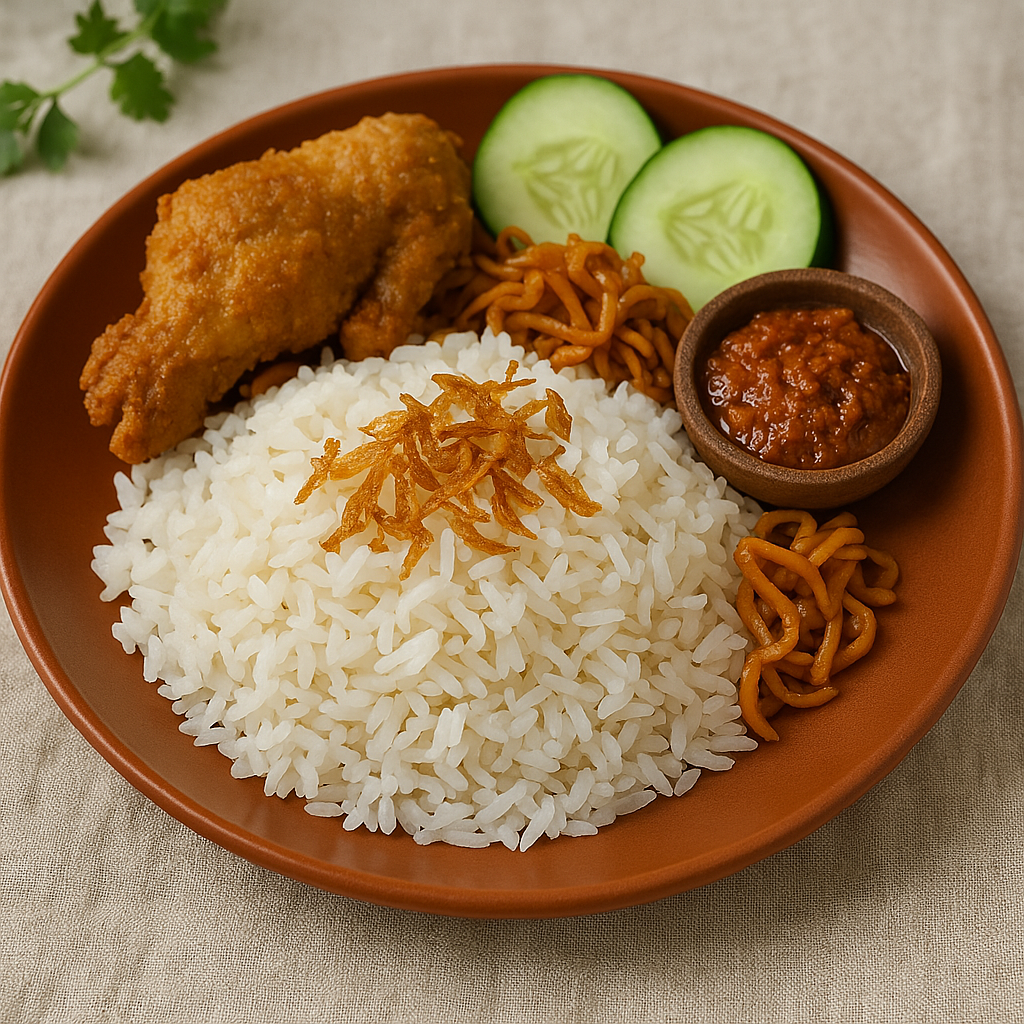 Setelah nasi matang, angkat dan sajikan di atas piring. Taburkan kacang goreng dan kerupuk di atasnya untuk memberikan tekstur renyah, serta tambahkan daun kemangi yang segar untuk memberikan aroma dan rasa yang lebih segar. Jangan lupa tambahkan juga sambal belacan atau sambal terasi untuk memberi rasa pedas yang menambah kenikmatan.